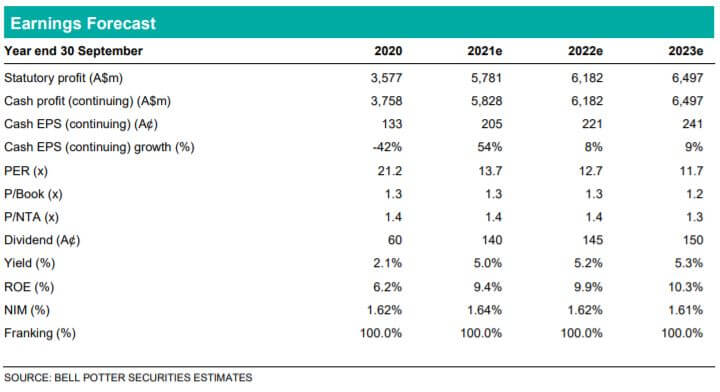 ANZ’s result will come out on Thursday 28 October 2021 and our FY21 forecasts are: 1) statutory profit $5.78bn; 2) cash profit $5.82bn; 3) cash profit (continuing) $5.83bn; 4) cash EPS (continuing) 205¢; 5) final dividend 70¢ fully franked, 2H21 payout ratio 70% (42% in 2H20); 6) cash ROE (continuing) 9.4%; 7) group NIM (continuing) 1.64%; 8) credit impairment charge -$0.42bn/-7bp GLA ($2.74bn/44bp in FY20); 9) CIR (continuing) 52%; and 10) Level 2 CET1 ratio 12.0%.
