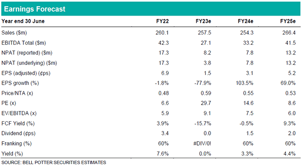 With growing conditions having worsened during key yield development months earlier this year, AVG’s company owned and leased crush came in materially below previous guidance at ~80kt (prev. 96k), representing a ~20% yield decline vs. 2022 (although we note this compares to anecdotal reports from smaller Riverland growers of -30-50% YOY). At this stage the company expects EBITDAS to improve in FY24e to be “directionally” in-line with FY22 (i.e. $43.7m).