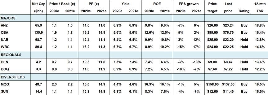 With the exception of MQG, earnings estimates across the forecast horizon are lowered by 7% on average for the majors and by 10% on average for the regionals (not surprising for the latter given their lack of scale) and price target reductions are similar in magnitude. Ratings for NAB and BOQ are lowered from Buy to Hold based on higher operating risk perceptions. MQG’s $158.00 price target and Buy rating are unchanged and the company remains the top pick across our coverage universe.