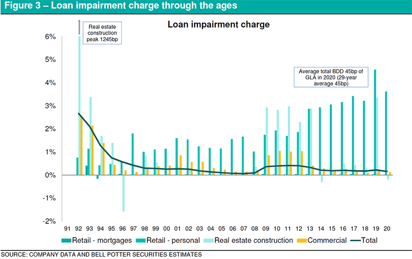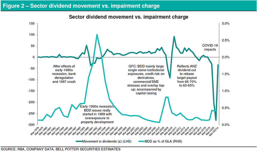 A sharp dividend rebound usually follows a financial crisis. Including COVID-19 impacts, bank dividends have gone backwards in only five periods in the past 40 years – with the other events being the 1987 stock market crash, the early-1990s recession, the GFC and some dividend reductions following APRA’s introduction of higher asset risk weights. We believe FY20’s COVID-19 related dividend reductions are more to do with regulators’ risk aversion than actual impairment charges – that are just provisions at this stage. Note that dividend reductions at the time of the early 1990s recession and the GFC are proportionately lower relative to the respective impairment charges. Given our view that COVID-19 provisions are surplus to requirements, any provision write-back or recovery is likely to find their way back to shareholders as special dividends.