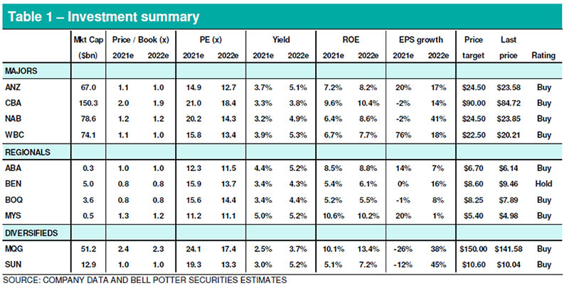 Cash ROE may have been around 8% in FY20 but was closer to 10% on an underlying basis (and especially in 2H20) for the major banks. While this slightly exceeds the average cost of equity of around 9%, we see upside from here as the economy improves and capital efficiency kicks in (higher dividends following APRA’s lifting of dividend restrictions or deployment into higher return investments). Of the majors, CBA continues to have the best underlying ROE although we can see the rest of the pack – all else being equal – improving towards the 10-12% range in the long term. Of the regionals, ABA and MYS have the best underlying ROE.