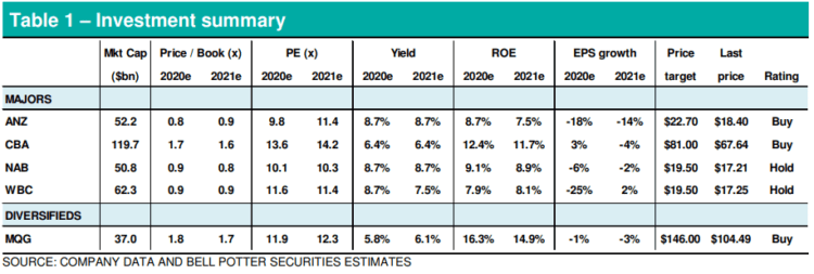 In addition to revising our estimates, we have also rebased valuations given upward trends in the banks’ cost of equity. The required country premium according to Bloomberg has increased by 1.7% since 16 January 2020 – likewise the respective cost of equity figures – and we believe it is only prudent to increase these assumptions for our banks (e.g. the majors’ cost of equity has increased by 1.3-2.7% and MQG’s by 1.4% over the same period). Taking into account medium term earnings estimate changes (ANZ -12%, CBA -6%, NAB -20%, WBC -18% and MQG -8%) and heightened market volatility, our price targets are adjusted as follows: ANZ -13% to $22.70 (Buy); CBA -5% to $81.00 (Buy); NAB -22% to $19.50, (Hold); WBC -19% to $19.50 (Hold); and MQG -8% to $146.00 (Buy). In addition to rankings from an overall risk perspective, our pecking order among these banks are unchanged: (1) MQG; (2) CBA; (3) ANZ; (4) NAB; and (5) WBC. We view MQG as a LONG TERM “Cash and Growth” story – so look past all the current market noise. Its investment proposition is also underpinned by a strong balance sheet, risk management capabilities, ability to deploy resources across the Group to generate returns in excess of those of its peers, ongoing cost discipline, adaptability to changing market conditions and access to value-adding global growth options.