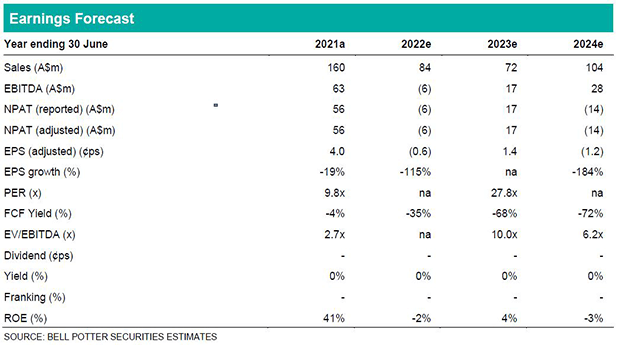 Iron Valley reported significantly weaker quarterly EBITDA of $1.8m and the September quarter result was restated from $17m to $3.5m. The hit to earnings caused by weaker iron ore prices, increased price volatility and increased quality discounts. Iron Valley’s relatively small scale and few monthly shipments exacerbates the earnings impact when cargos are priced at their destination in weaker markets. With iron ore prices strengthening into 2022, BCI expect some of this earnings weakness to unwind. However, persistently high quality discounts have continued into this year. Ordinarily, this earnings weakness would be of concern. However, BCI’s Mardie funding is now arranged with little call on Iron Valley’s earnings to support the project’s development. EPS changes in this report relate to adjustments to our Iron Valley assumptions alone: FY22 now -0.6cps (previously 2.7cps); FY23 now 1.4cps (previously 1.9cps); and FY24 now -1.2cps (previously -1.0cps).