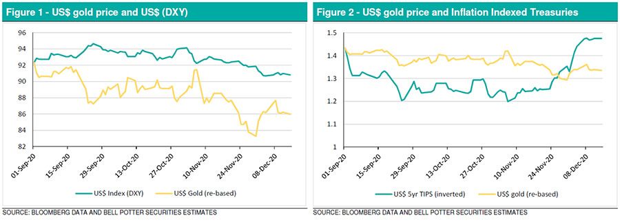 - The reflation trade also appears to be driving a degree of asset re-allocation to risk assets / cyclicals and overriding the influences of a weakening US dollar and lower real interest rates. These are typically two of the strongest negative correlations for the US$ gold price. Yet, over the last couple of months we have noticed an emerging disconnect that has seen both weaker US$ and lower real interest rates coincide with a dropping US$ gold price since mid-September.