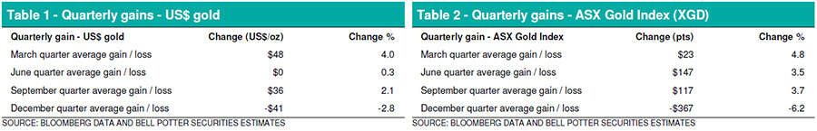 Unsurprisingly, this carries through to the equities which have displayed leveraged performance in both directions to the US$ gold price (a key sentiment driver, typically overshadowing A$ gold). On average, the ASX Gold Index has returned -6.2% over the same December quarters and delivered outperformance in the other quarters.