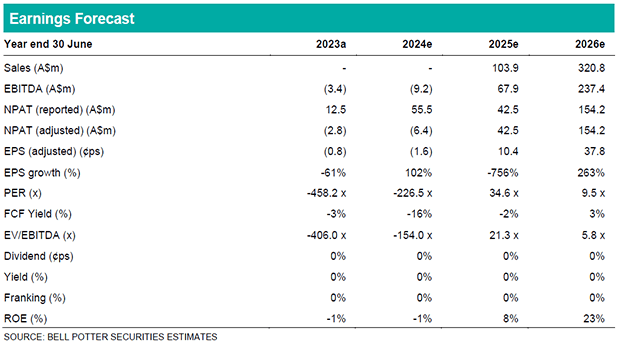 We’ve run two scenarios, assuming flow rates remain constant, with the exception of lower tenors of 47mg/l in the pregnant leach solution (PLS) and lower recovery (95%). The difference in each scenario is timing of commissioning, defined as filling the IX columns with PLS. Under the first scenario, we assume commissioning at the beginning of the quarter, similar to IX 1 which was commissioned in early Apr-24, and the second scenario we assume a mid-quarter commissioning. The greatest variability outside commencement of commissioning will be the PLS tenor and recovery. Should the current conditions hold, BOE is in a comfortable position to beat guidance and consensus for FY25 production, in our opinion. Visible Alpha production consensus is 850Mlbs for FY25, scaling from 103klbs in Sep-Q to 321klbs in Jun-25.
