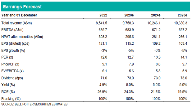 We make no change to our forecasts at this stage given the acquisition is subject to various conditions and shareholder approval. If it does proceed, however, there would be no impact on our 2023 forecasts – given the acquisition will not occur till 2024 – and EPS upgrades of approximately 3% and 6% in 2024 and 2025. Note these upgrades assume the acquisition occurs at the end of February – so 10 months contribution in 2024 – and a flat margin of 3.0% in 2024 but an improvement to 3.5% in 2025.