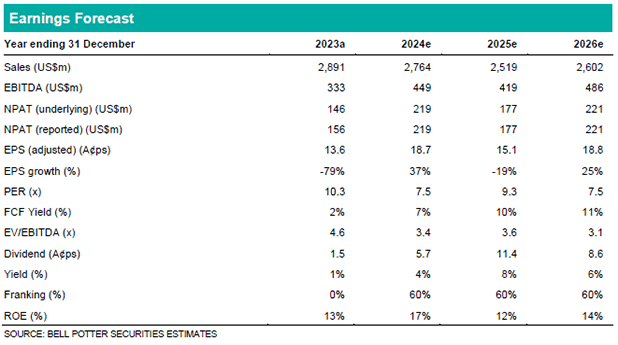 CRN reported NPAT of US$156m (BP est. US$152m) and underlying EBITDA of US$382m. A net cash position of US$97m and available liquidity of US$489m were reported at last month’s December 2023 quarterly release. A final dividend of US$0.005/sh was declared, in line with its biannual fixed dividend policy.