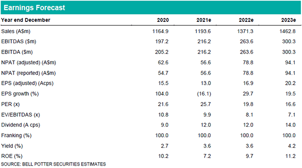 We have updated our forecasts to include updated earnings guidance, the acquisition of 2PH and associated equity funding. The net impact is an EPS downgrade of -14% in CY21e, unchanged in CY22e, and upgrade of +13% in CY23e. Our target price falls to $4.30ps (prev. $4.60s) reflecting lower avocado earnings and dilution from the equity raising, offset in large by 2PH earnings.
