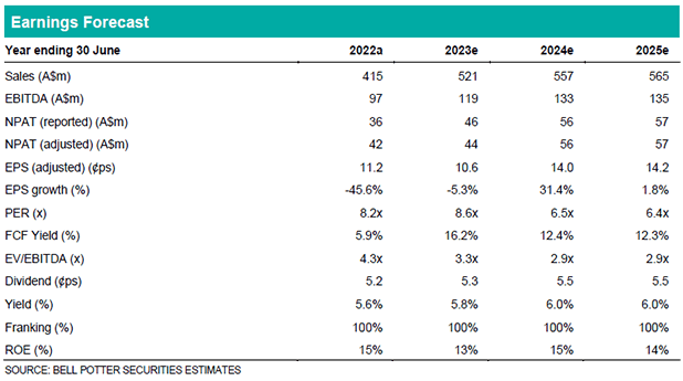 DDH also provided a FY23 earnings update: underlying EBITDA is expected to be within $117-121m (BPe old $128m). The earnings update reflects a continuation of weak operating conditions since early January 2023 due to delayed customer drilling program commencements and regulatory approvals, and wet weather. On a positive note, utilisation and revenues are improving in Q4 FY23 as customer drilling programs recommence. In this report, EPS downgrades reflect this weaker than expected operational update: -12% FY23; -3% FY24; and nc FY25.