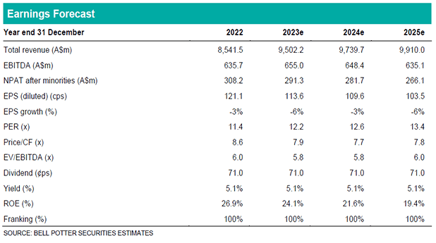 We have updated our forecasts for the increased stake in the BYD retail JV but there is no change in our underlying forecasts. Eagers already consolidates the JV – despite only originally having a 49% interest – so the only change is in the minority interest and NPAT after minorities. There is, therefore, no change in our revenue or underlying operating PBT forecasts but there is modest upgrades in our EPS forecasts of 2%, 3% and 5% in 2023, 2024 and 2025. Note we continue to forecast 2023 revenue of $9.5bn which is consistent with the guidance of b/w $9.5-10.0bn and believe the key swing factor in this range is the level of revenue from the BYD JV.