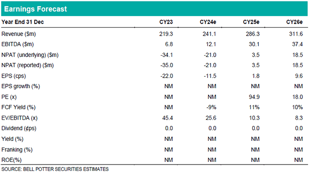 We have made no changes to our CY24 revenue forecast ($241.1m) and expect a softer 2H due to certain revenues being recognised earlier in the year. We are comfortable our full-year forecast is covered by the current orderbook, so any risk to our estimates is likely to the upside based on the potential for new contracts awarded in the 2H. We have updated our working capital forecasts and corresponding cash flows in-line with the announcement, and we expect improved cash flow results in 2H24 and 1H25. Our CY24e EBITDA forecast remains unchanged ($12.1m) and we continue to forecast a return to profitability in CY25.