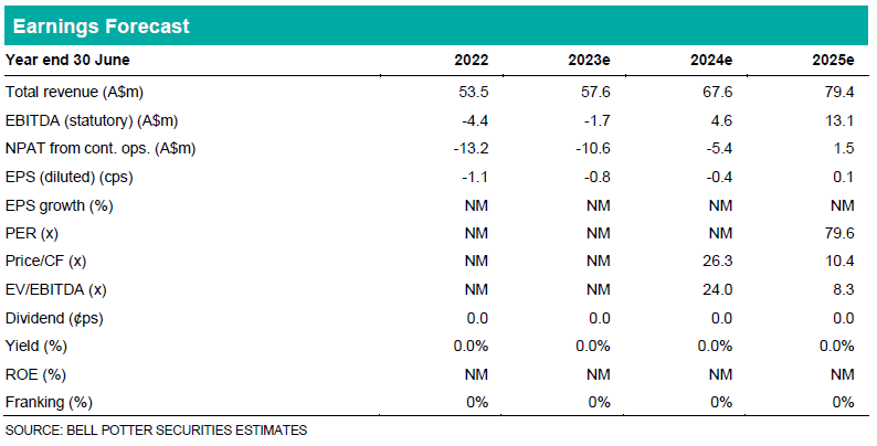 and a 9.1% WACC and 4.5% terminal growth rate. The net result is no change in our PT of $0.20 which is >100% premium to the share price so we maintain our BUY recommendation. Potential catalysts include the upcoming FY23 result (e.g. potential positive adjusted EBITDA in H2) and the FY24 outlook (e.g. positive free cash flow).