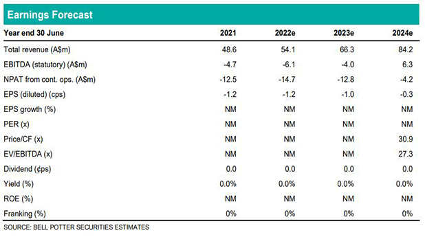 We have modestly downgraded our revenue forecasts by 2%, 3% and 3% in FY22, FY23 and FY24. We have also modestly increased our forecast EBITDA losses in FY22 and FY23 and reduced our forecast positive EBITDA in FY24 on the back of the lower revenue. The downgrades are driven by currency and also a reduction in our ARR forecasts at year end which lowers the recurring revenue forecasts. Note we now forecast ARR at year end of A$51.2m in FY22 – versus A$54.6m previously – and a key driver of the downgrade is we no longer assume a material contract from WA’s Water Corporation this financial year but rather next.