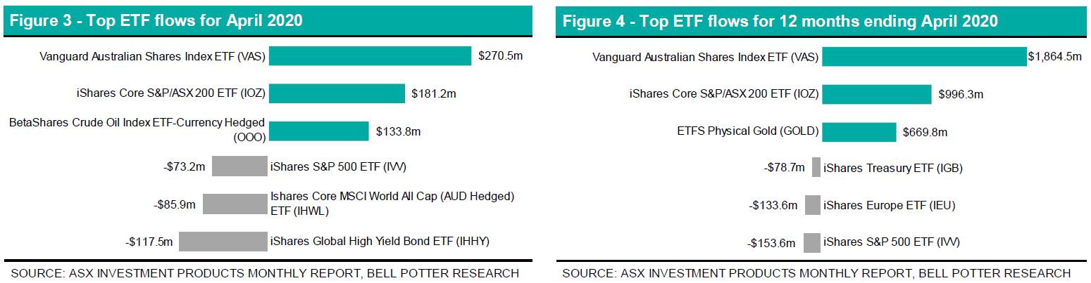 Commodities again received strong net inflows, with $211m in April. BetaShares Crude Oil Index ETF – Currency Hedged (Synthetic) (OOO) increased the units outstanding by 585% over the month. The Bell Potter March 2020 ETF Report highlighted the risks associated with OOO, which during the month changed the investment mandate to add further protection from the volatility of the futures price of WTI crude oil. OOO has effectively become an actively managed fund during this period which should add further caution to potential investors seeking to gain exposure to a potential rebound in the price of oil. The futures exposure that OOO aims to provide to unitholders is now at the discretion of the fund provider until further notice. ETFS Physical Palladium (ETPMPD) returned -19.6% in April as a reduction in auto sales may have modestly contracted the demand for the precious metal. Gold continued to see strong net inflows as a hedge to the volatility in the global markets.