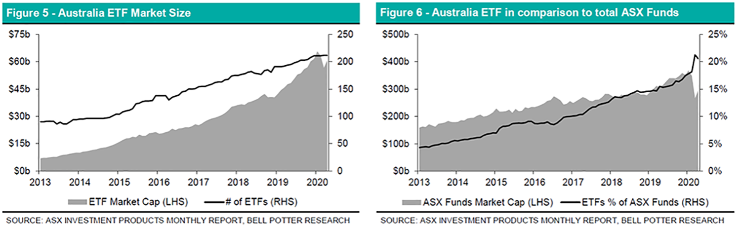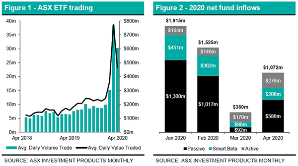 ETF trading has increased significantly over the past 3 months, with average daily value traded in March and April exceeding $770m and $460m, respectively. Despite the sell-off that has occurred in 2020, funds have stayed in the ETFs with each month recording positive net inflows. There are a variety of ETFs that can assist investors gaining exposure to a range of investment classes to diversify and assist stability to portfolios during periods of high volatility.