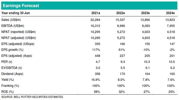 Larger grade and quality discounts and increased costs expensed by FFI are the primary drivers of a moderate trim of our earnings forecasts. Our forecast FY22 and FY23 earnings are lowered 7% and 4% respectively. Our lowered FY22 dividend of A170cps equates to an 8.0% fully franked dividend yield. Our NPV-based target price increases by 4% on our increased forecast contribution from Iron Bridge and an increased notional valuation for FFI. The dividend yield supports our Hold rating.