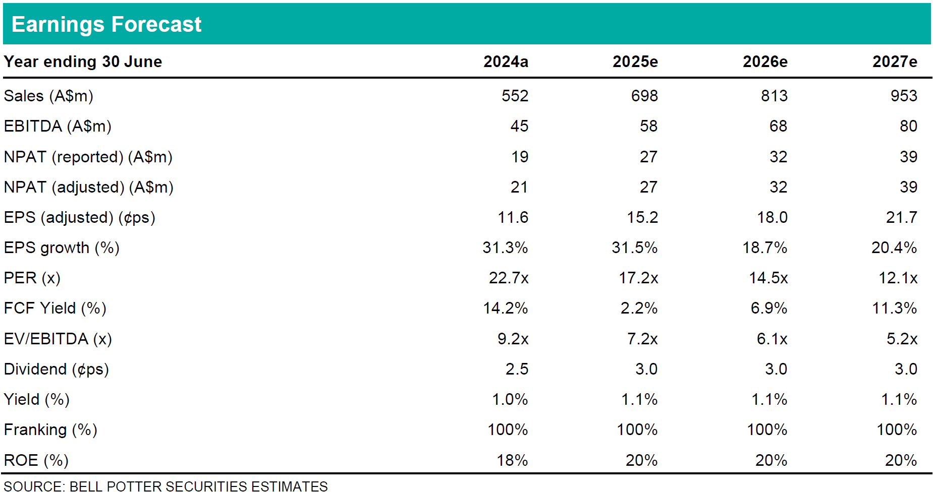 Orderbook analysis: We have illustrated the revenue recognition profile of 8 major contracts announced over FY24-25 for completion in 2H FY25 onwards. Findings of our analysis highlight: (1) ~90%+ of our revenue forecasts are now contracted, giving us a high degree of confidence in our 23% EPS CAGR outlook; and (2) each successive major contract award from now will likely drive an upgrade to our (and possibly consensus) forecasts. You can find more details of our analysis on page 2 of this report.
