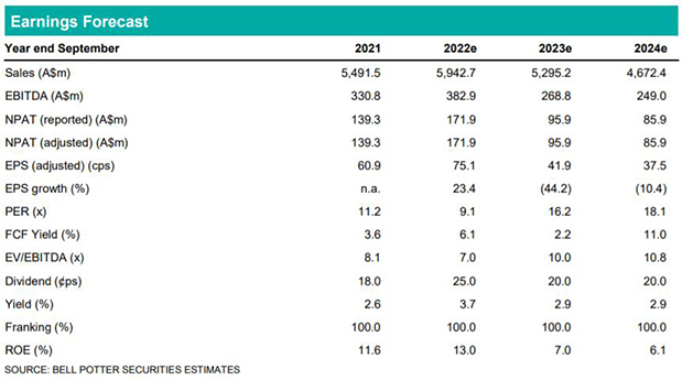 FY22e is likely to benefit from two of the largest east coast crops on a record at a time when northern hemisphere crop failures have elevated canola crush and marketing returns. FY22e earnings look to reflect a seasonal high, with an expected 35-40% contraction in EBITDA and 45-50% contracting in NPAT when conditions normalise. We downgrade our rating from Hold to Sell.