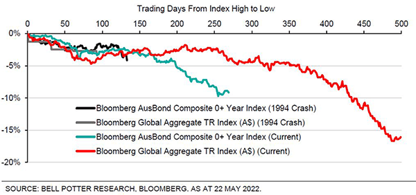 Given that inflation is mathematically defined as the persistent increase in the price level over time (rate of change), a singular jump does not mean that an economy is experiencing inflation. An increase in the price of a single good/service, or in relative prices of some goods/services, does not signal that inflation is present either. The prices of almost all goods and services must be increasing. We believe that this is unsustainable, particularly as central banks begin to destroy aggregate demand. The forward looking bond markets have been pricing in aggressive rate hikes, producing a harsh and protracted sell-off as the present value of a bond’s payments, or its market value, decrease as bond yields increase. Central banks, especially Australia, have been far behind on yield curve control. Add to this the fact that our wage push is lagging, plus funding costs would increase at a time when the economy sits as highly levered. Investment Grade bonds then begin to look reasonably attractive from a longer-term investment horizon.