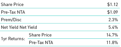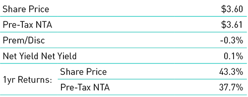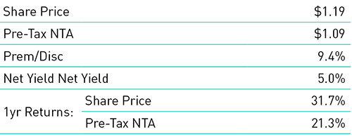 GVF invests globally using a discount capture strategy, owning a range of global assets purchased at a discount to their intrinsic value. GVF aims to provide an alternative source of market outperformance compared to more common stock selection strategies, identifying or creating catalysts that will be used to unlock the identified value The portfolio has an allocation of ~40% in listed equity. Based on the last close price of $1.075, GVF’s recently declared fully-franked FY20 interim dividend of 2.9cps provides an annualised net and gross yield of 5.4% and 7.4%¹, respectively.