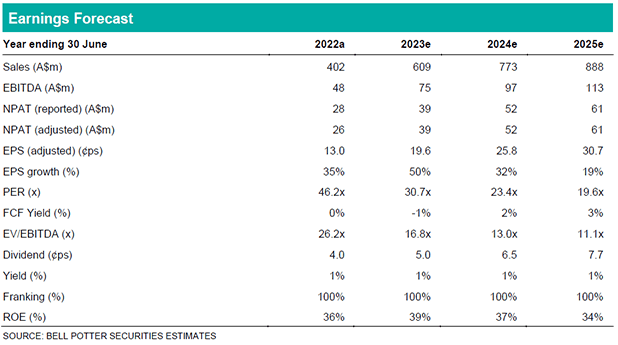 Having materially exceeded its twice-upgraded FY23 revenue guidance, management’s messaging of FY24 financial performance is now key. It is clear the FY23 financial performance exit-rate is strong, with positive momentum across Australian and North American operations to carry forward into FY24. Our outlook indicates EPS growth of 31.6% in FY24, compared with 50.3% (BPe) in FY23. At the current share price, we believe this EPS growth outlook is appropriately priced-in.