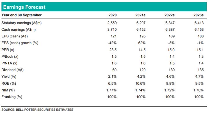 NAB will report its FY21 result on Tuesday 9 November and our forecasts include: 1) statutory earnings $6.30bn; 2) cash earnings $6.45bn; 3) cash EPS 195¢; 4) cash earnings ex-large notable items (i.e. excluding restructuring-related costs and customer-related remediation) $6.52bn; 5) cash EPS ex-large notable items 197¢; 6) fully franked final dividend 60¢; 7) ROE 10.6% (10.7% ex-large notable items); 8) NIM 1.74%; 9) credit impairment charge $0.00bn/0bp GLA; and 10) Level 2 CET1 ratio 11.7%. The performance reflected better credit impairment outcomes with ongoing momentum across home, SME and New Zealand lending. The bank still remains “optimistic about the long-term outlook for Australia and New Zealand” – still positive overall in the long run.