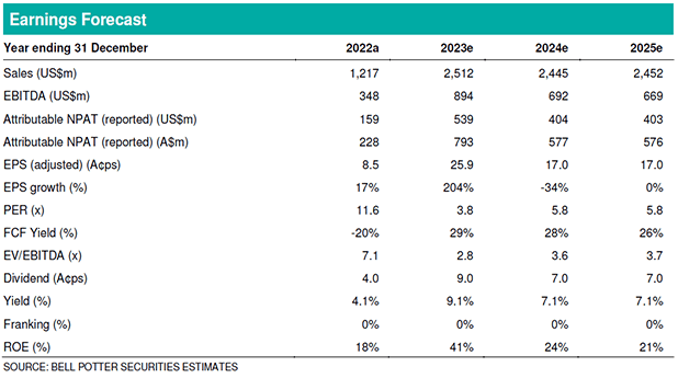 NIC reported its CY22 full year financial result delivering record production and financial performance. NIC reported consolidated revenue of US$1,217m (vs BPe $1,202m, up 88%), consolidated EBITDA of US$339m (vs BPe $327m, up 40%), consolidated NPAT of US$209m (vs BPe $195m, up 19%) and attributable NPAT of US$159m (vs BPe US$147m, up 15%). The main differences between the reported results and our forecasts were higher withholding tax payments and higher bond issue costs. NIC declared a final dividend of A2cps for total CY22 dividends of A4cps (vs BPe A3cps for the full year). NIC ended CY22 with cash of US$144m and gross debt of US$550m in Senior Secured Notes, for net debt of US$406m and net gearing of 24%.