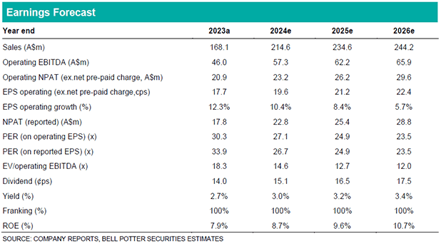 We factor in the acquisitions announced today where we forecast a 3-month contribution in FY24e and $5m annualised revenues in FY25e. On the back of the full year contribution in FY25e, we estimate a ~2% incremental contribution to our forward revenues and ~1% accretion to NPAT, in line with the company’s expectations for earnings accretion in year 1. We also account for minor scale benefits in the operating cost line over the longer term given PFP’s market share of ~11% that we estimate with the recent acquisitions annualised. The net result sees our NPAT forecasts +0.1%/+1.1%/+0.8% for FY24/25/26e.