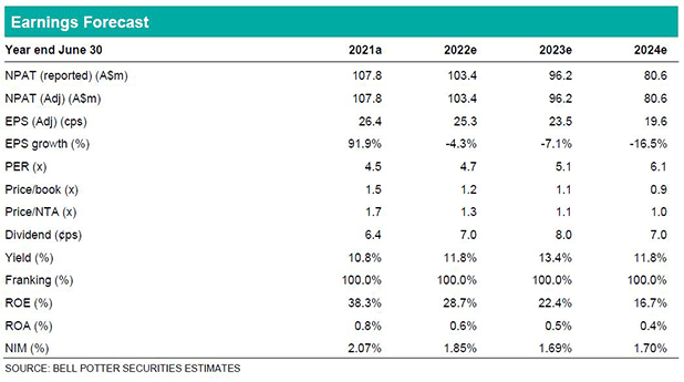 Despite the strong revenue and profitability growth that the company has, and continues to generate, it’s shares have been de-rated from a high of $2.73 (Feb 2021) to just $1.19, representing just 4.7 times 2022 prospective earnings. In this note we consider what sort of conditions could justify such a low valuation and estimate that to justify the current share price, the company would have to write off around 3% of mortgage assets, or c.$560m. To put this in context when Covid-19 struck and 10% of the book was put on hardship payment moratoriums, it took a collective provision of just $16m (from which minimal write-offs have materialised). To get a valuation close to the current share price implies a scenario that we regard as both extreme and unlikely. Our target price is $2.15 per share, set using a NPV of future profitability as a proxy for a DCF valuation. The next news event is the 2022 full year results in August.