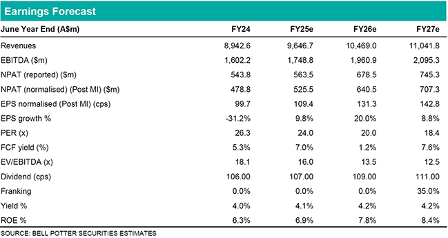 SHL should return to growth, with c.7.9% / c.9.1% / c.9.7% revenue, EBITDA and Normalised NPAT growth. We expect EBITDA margins to begin to recover in FY25 and deliver c.110bp improvement through to FY27. Growth is being driven by right sizing the business, the impact of acquisitions in FY24 and normalising organic operations post COVID. Our estimates are broadly in line with consensus.