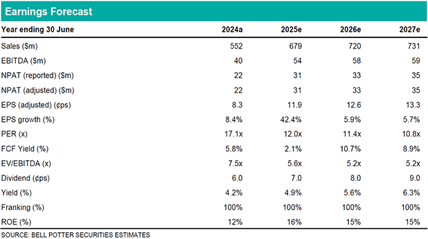 FY25 EBITDA guidance: SXE continue to anticipate FY25 EBITDA of at least $53.0m (BPe $54.2m, implying >21% YoY growth). While FY25-to-date contract awards are encouraging for expected activity growth across the Group, we do anticipate a high level of work replenishment as contracts complete over FY25, maintaining an elevated EBITDA run-rate into FY26 (vs FY24: $40.1m). We see upside to our forecasts should FY25-to-date contract award momentum continue in 2H FY25.