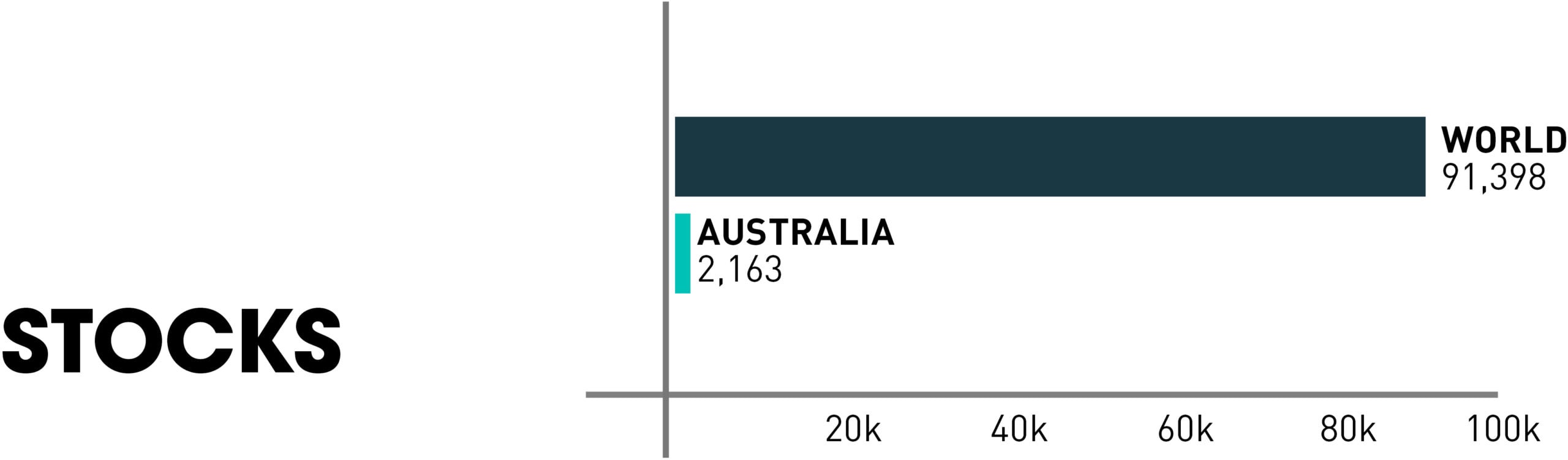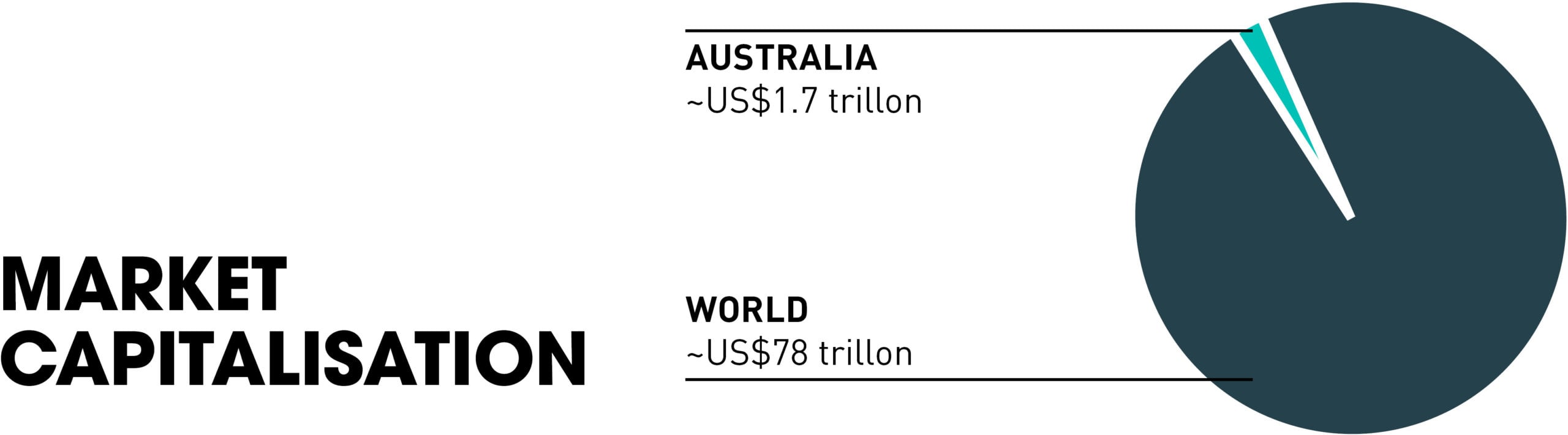 There are 60 major stock exchanges in the world and 91,398 active securities with a total value of ~US$78 trillion. The Australian share market is currently ranked 10th with a market capitalisation of A$2.4 trillion (US$1.7 trillon) and average daily turnover of over A$5 billion. While there are 2,163 stocks listed on the ASX within 11 sectors, most of the value is made up of the Top 200 stocks by market capitalisation (The S&P/ASX 200 Index).
