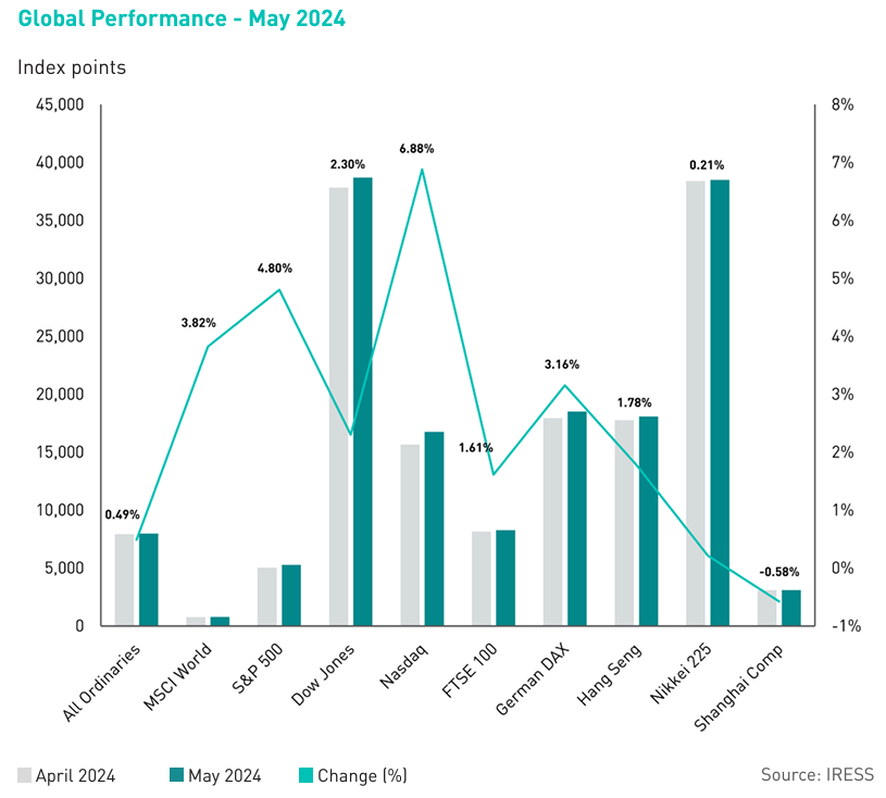 Following a very strong recent run, most share markets took a breather in the final week of May but overall posted healthy gains for the month. The S&P 500 added 4.8%, Nasdaq was up 6.9%, and MSCI ACWI Index finished the month 3.8% higher. However, the U.K.’s FTSE lagged, up 1.6% as surprise general elections weighed on investor sentiment while China’s Shanghai Composite underperformed, slipping 0.6%.