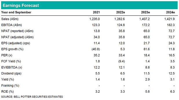 On face value FY22e EBITDA is expected to be below our previous expectations, though driven for the most part by higher supply chain and barley procurement costs (these appear one off in nature). Following the update and incorporating higher debt and debt funding rates in outward years, we have downgraded our NPAT forecasts by -23% in FY22e, -6% in FY23e and -7% in FY24e. Our target price which is predicated on long-term returns is unchanged at $4.35ps.